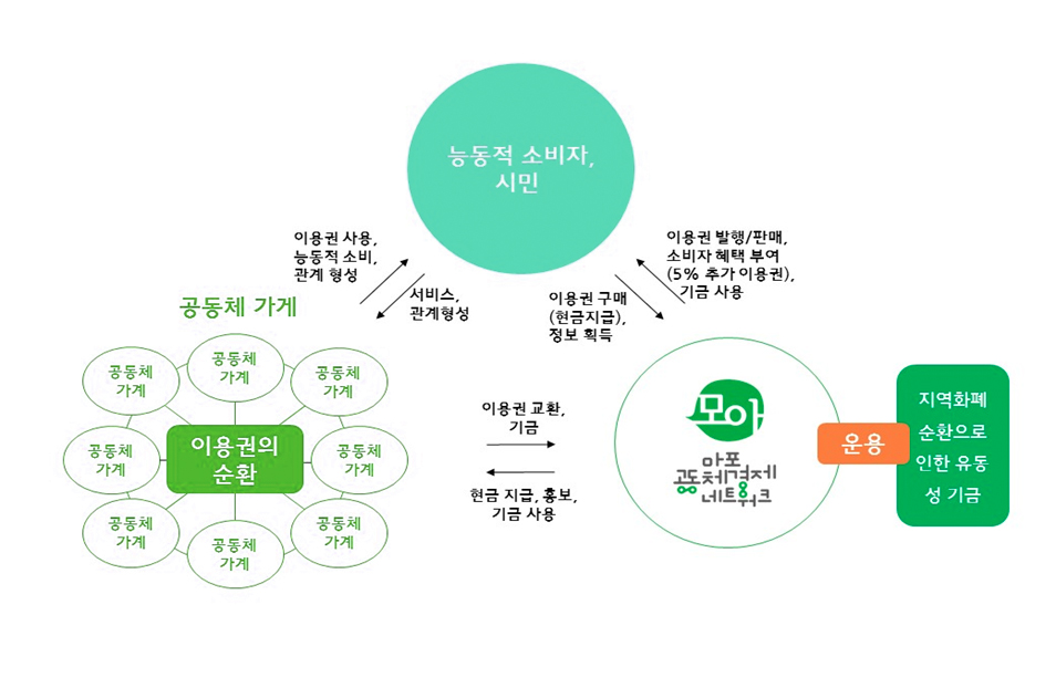 모아가 재사용되는 만큼 모아지는 유동성자금은 공동체가게와 사용자에게 사용되고, 지역에서 순환되게 할 계획입니다.